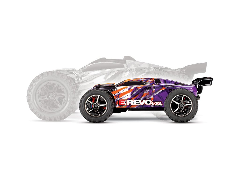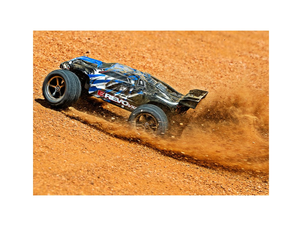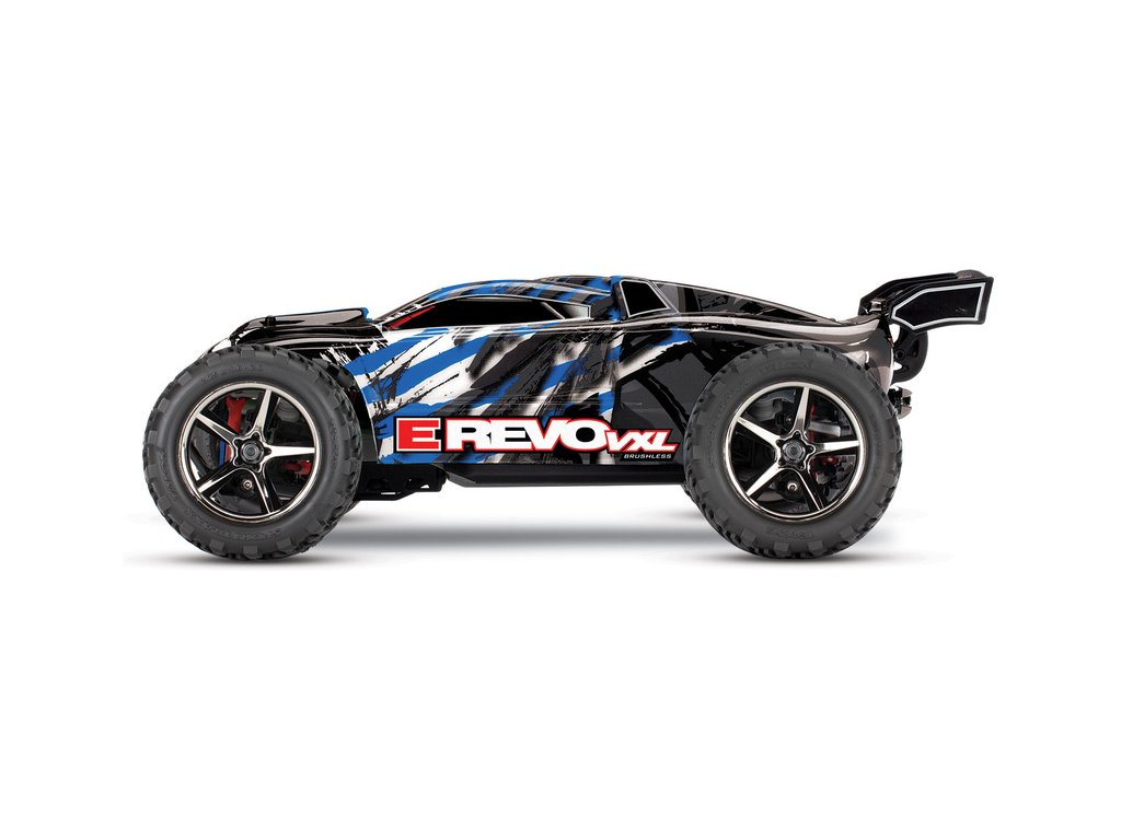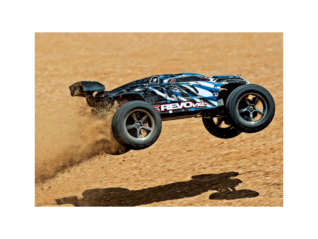 Výkonný RC model E-Revo VXL 4WD v měřítku 1:16 se střídavým motorem velikosti 380, RC soupravou Traxxas TQi 2.4 GHz a stabilizačním systémem jízdy Traxxas TSM. Šasi obsahuje speciální systém odpružení s vahadly, samozřejmostí je plná výbava kuličkovými ložisky, velké 12 mm šestihrany nábojů kol, olejové stavitelné tlumiče a uzavřené silikonem naplněné diferenciály s kovovými převody.