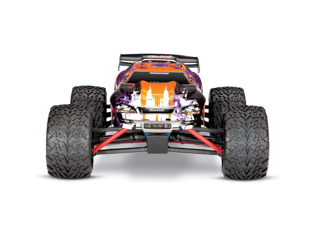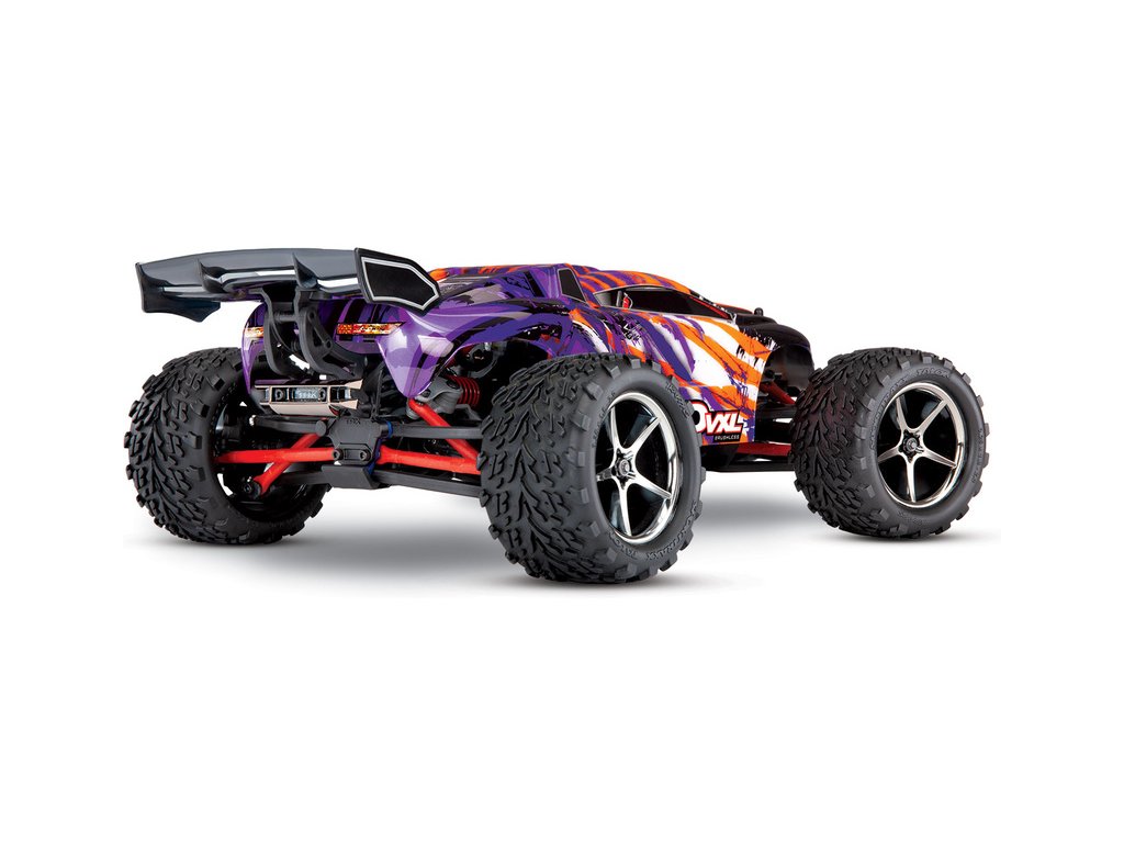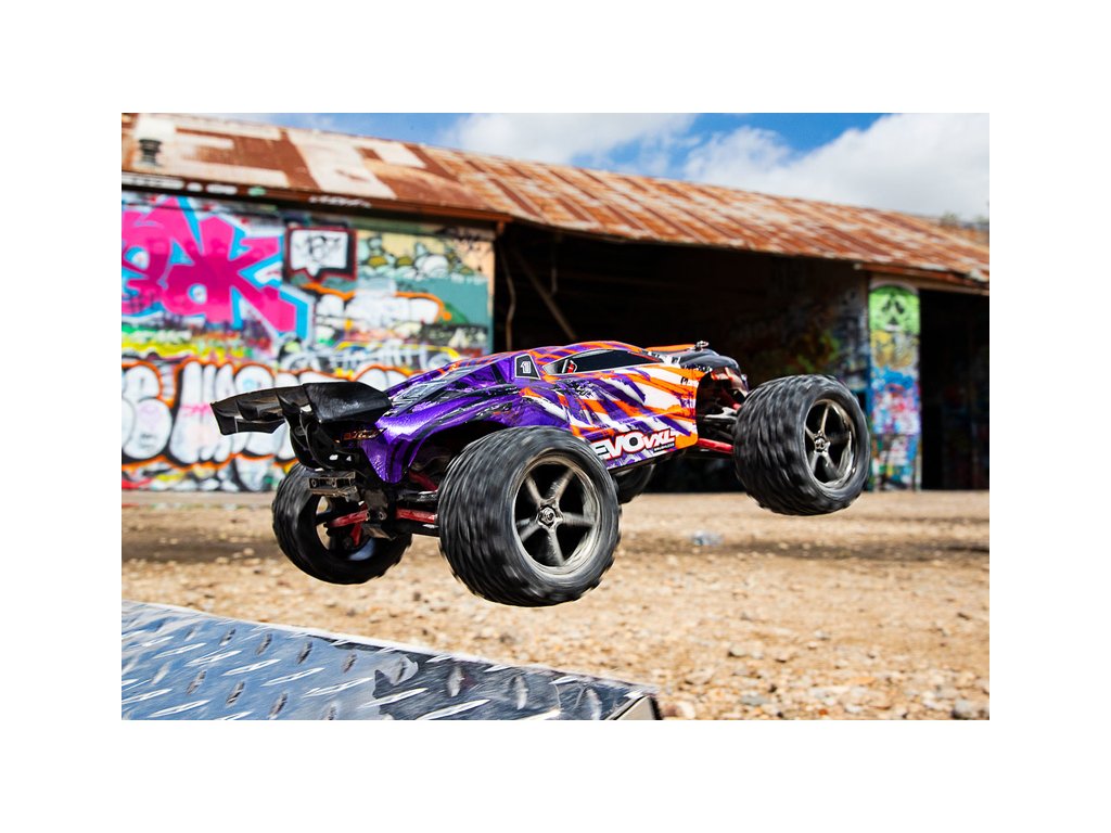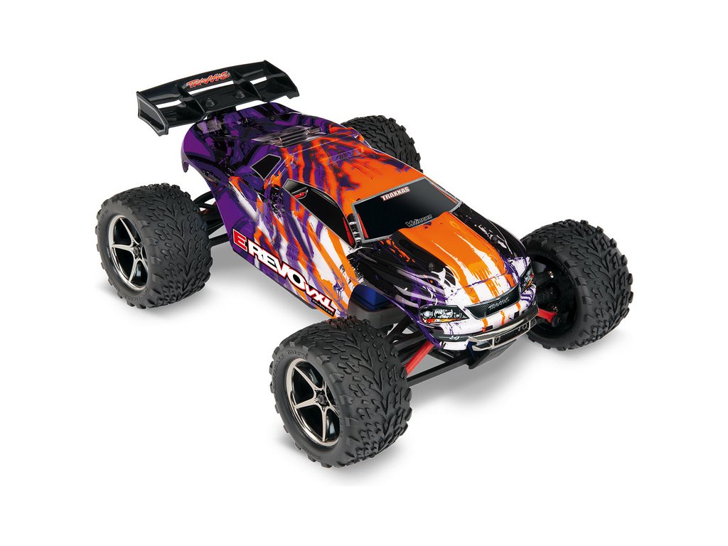Výkonný RC model E-Revo VXL 4WD v měřítku 1:16 se střídavým motorem velikosti 380, RC soupravou Traxxas TQi 2.4 GHz a stabilizačním systémem jízdy Traxxas TSM. Šasi obsahuje speciální systém odpružení s vahadly, samozřejmostí je plná výbava kuličkovými ložisky, velké 12 mm šestihrany nábojů kol, olejové stavitelné tlumiče a uzavřené silikonem naplněné diferenciály s kovovými převody.