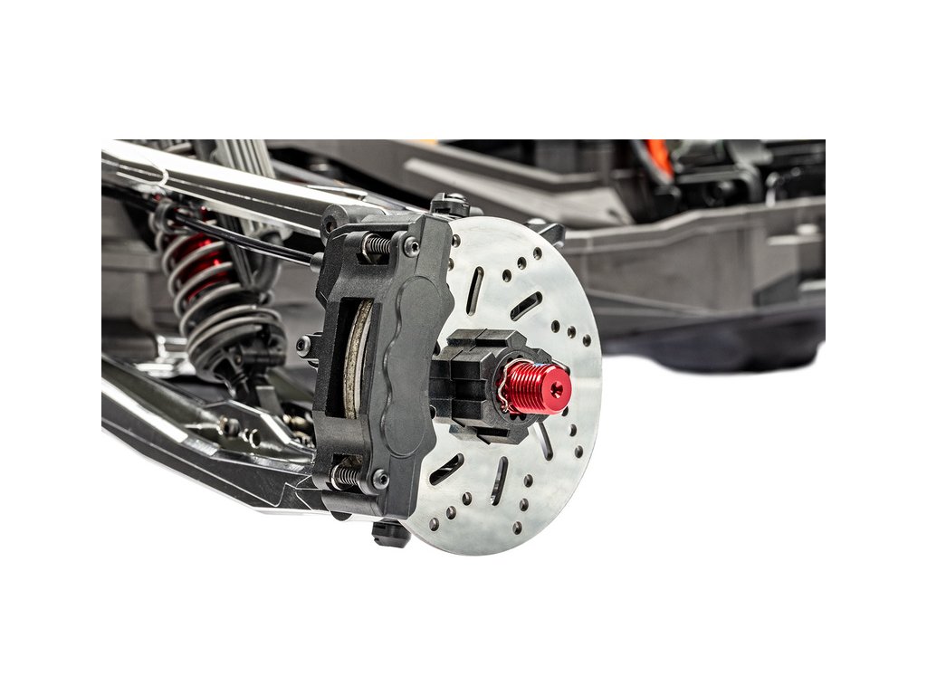 Výkonné přední kotoučové brzdy spolupracují se zadním brzděním pomocí motoru a zajišťují silný a kontrolovaný brzdný výkon na všech čtyřech kolech. Brzdové destičky v třemenech svírají nerezový kotouč, který je pro maketový vzhled opatřen chladícími otvory. Brzdy jsou ovládány servem přes bowdeny.
