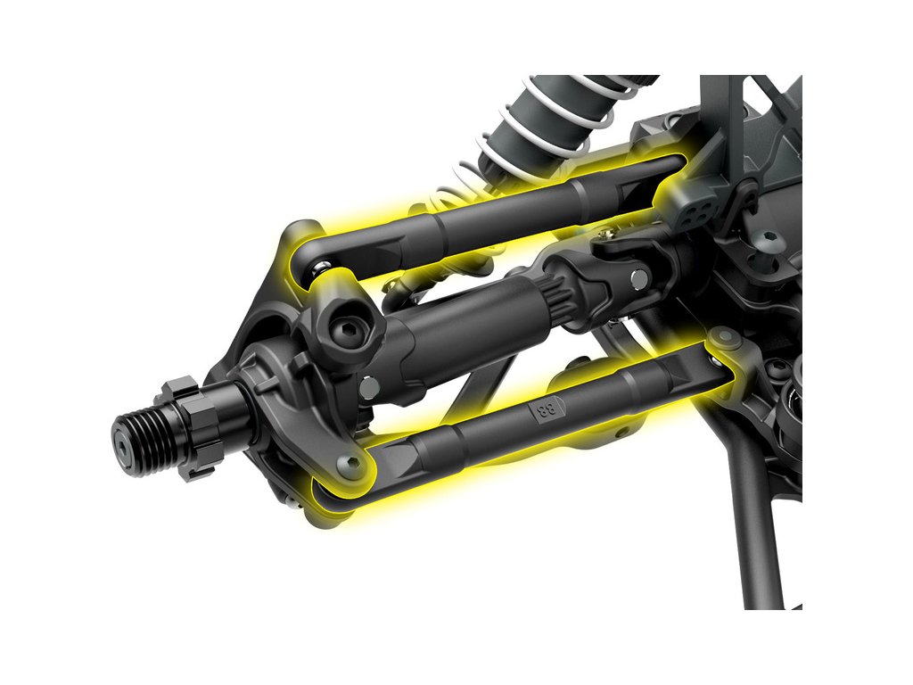 Dlouhý zdvih ramen tlumí i prudké nárazy a zlepšuje ovladatelnost modelu. V každé situaci tak bude mít přesnou a rychlou odezvu řízení, díky maximální kontaktu s podkladem.