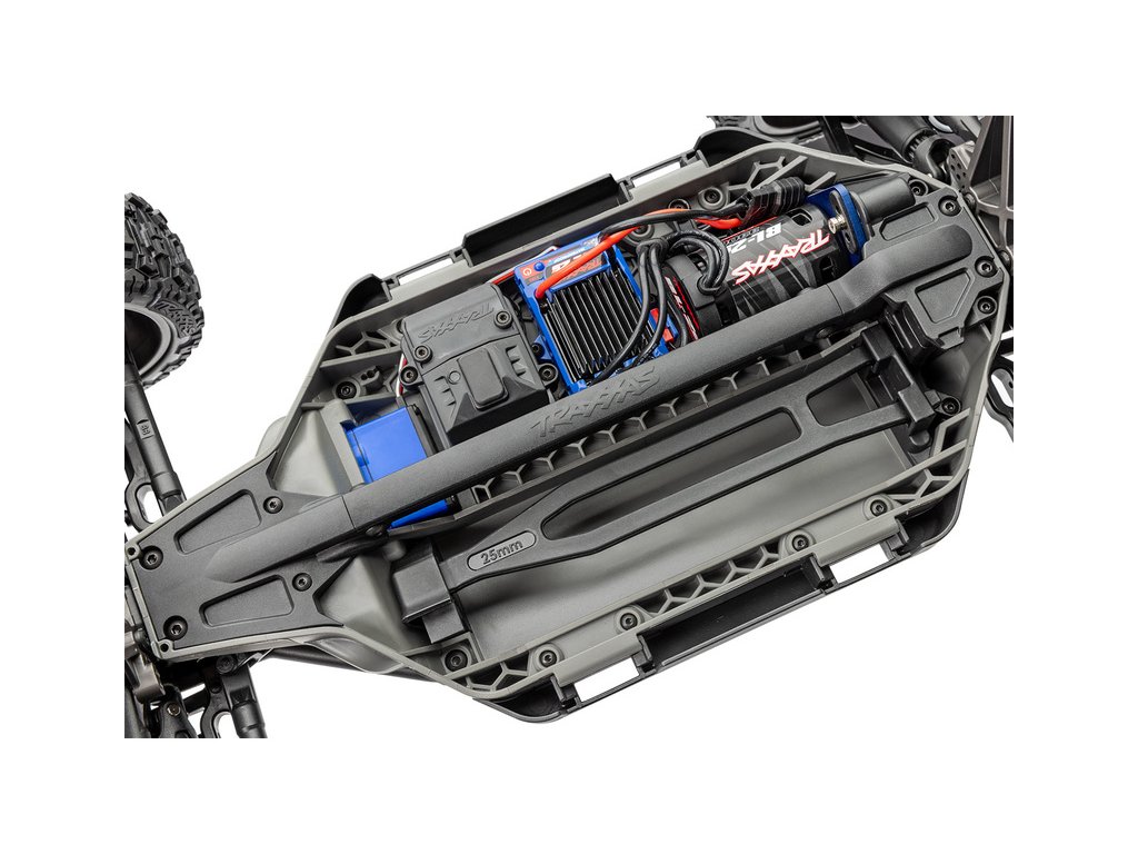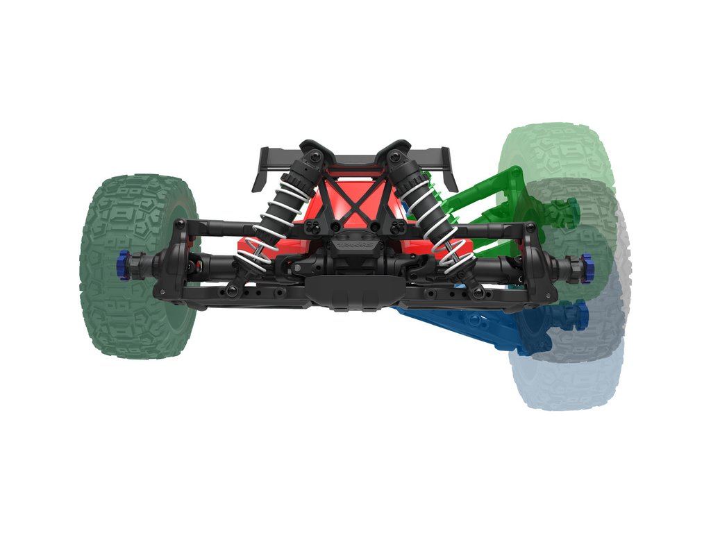 Továrně instalované komponenty zavěšení a prvků pohonu pro vysokou odolnost - Extreme Heavy Duty, jsou vyrobeny z těch nejodolnějších materiálů, které společnost Traxxas používá. Pevnost dále zvyšuje středová výztuha a věže tlumičů s dvojitým uchycením proti střihu. Robustní poloosy mají vylepšené uchycení kardanového kloubu.