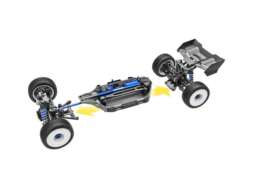 Nová platforma využívá modulární konstrukci pro snadný servis, podvozek je rovný a spodní kluzné desky umožňují sklouznutí modelu po břiše. Pevnost prostorového šasi posiluje středová hliníková výztuha T-Bar s barevným eloxováním. Výborné pohlcení nárazu zajišťují hliníkové tlumiče GTR, které oproti standardním obsahují vetší množství oleje, výjimečně hladký chod a pohodlné nastavení předpětí pružin. Výkon motoru je přenášen přes středový diferenciál, středovou hřídel k přednímu a zadnímu diferenciálu s kovovými převody a přes robustní teleskopické poloosy až ke kolům. Pro snížení naklánění modelu při jízdě na trati můžete instalovat volitelné příčné stabilizátory (prodávají se samostatně).