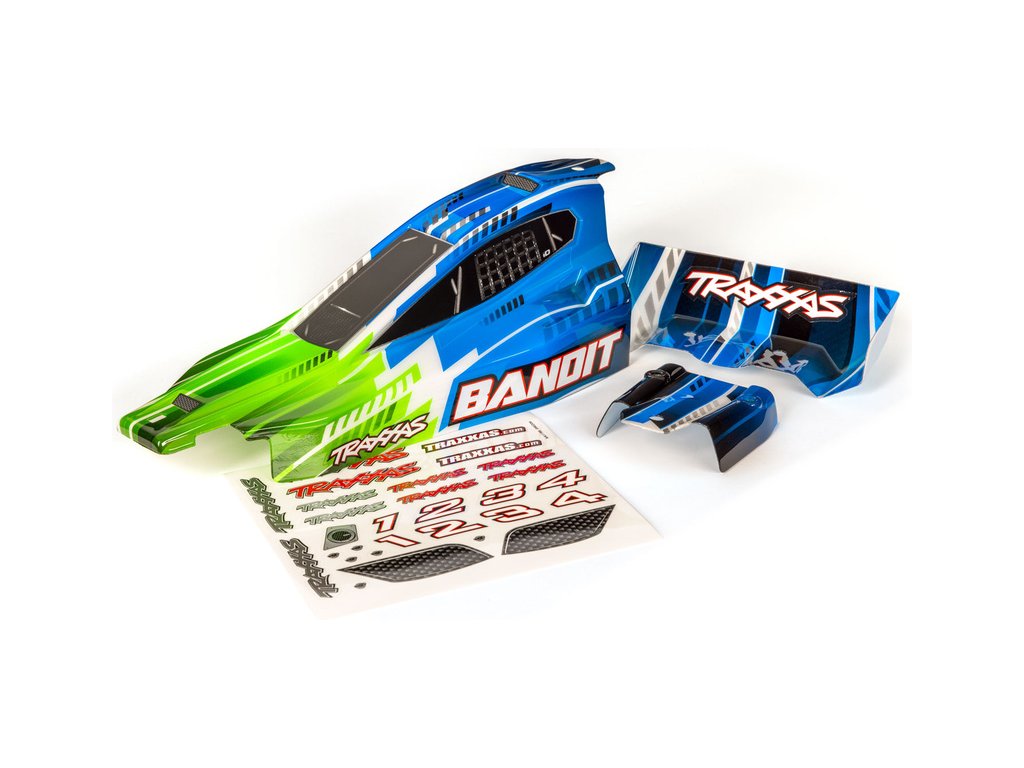 Hotová Traxxas karosérie Bandit zelená, má kompletní a hotové zbarvení s aplikovanými obtisky. Tato odolná polykarbonátová karosérie má nejžhavější barvu ProGraphix® s originální barevnou kreací a je připravena k montáži na vaše auto Traxxas Bandit 1:10.