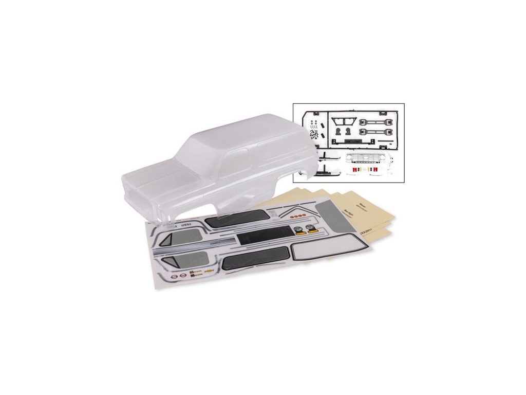 Traxxas karosérie Chevrolet Blazer 1979 čirá, vyžaduje barvení, pro bezsponkový systém uchycení. Včetně přední mřížky, zrcátek, klik, nárazníků, archu samolepek a bezsponkového uchycení. Určeno pro montáž na blatníky #8072X.