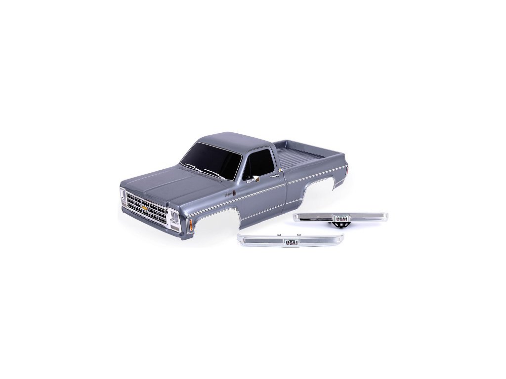 Náhradní díl pro RC modely aut Traxxas TRX-4 Chevrolet K10 1979: karosérie stříbrná (kompletní nabarvená). Včetně přední mřížky, zrcátek, klik dveří, stěračů). Rám bez-sponkového systému upínaní karoserie.