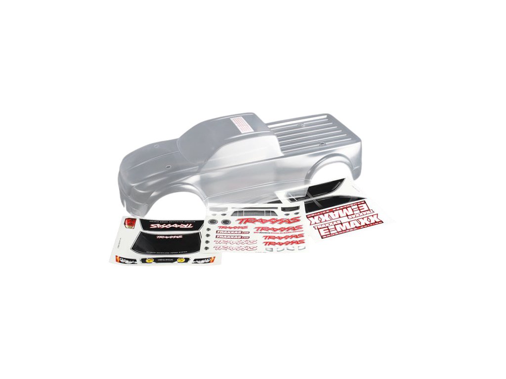 Nenabarvená lexanová karosérie pro RC model auta Traxxas E-Maxx na střídavý motor (Brushless) . Součástí je arch samolepek.