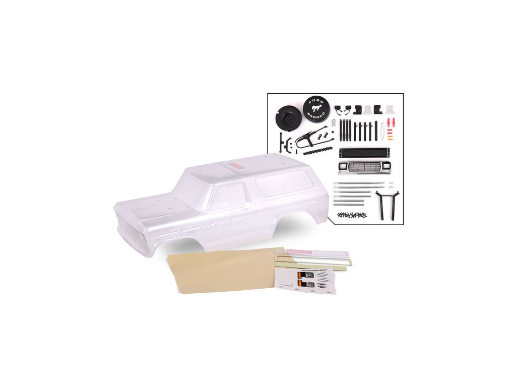 Kompletní čirá karoserie Ford Bronco 1979, vyžaduje barvení a kompletaci. (Obsahuj mřížku chladiče, boční zrcátka, kliky dveří, stěrače, náhradní pneu, masky oken a nálepky). Určeno pro montáž na vnitřní blatníky.