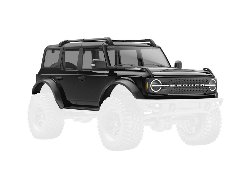 Traxxas karosérie Ford Bronco 2021 černá, pro RC model auta TRX-4M. Bez-sponková karoserie v měřítku 1:18 z ABS, kompletní, včetně čirých oken, makety rezervního kola, lemů blatníků, bočních zrcátek a dalších detailů.