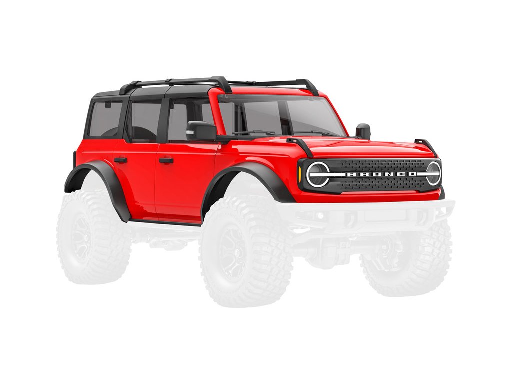 Traxxas karosérie Ford Bronco 2021 červená, pro RC model auta TRX-4M. Bez-sponková karoserie v měřítku 1:18 z ABS, kompletní, včetně čirých oken, makety rezervního kola, lemů blatníků, bočních zrcátek a dalších detailů.