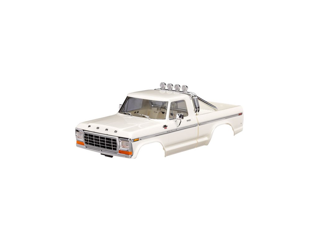 Traxxas karosérie Ford F-150 1979 bílá, pro RC model auta TRX-4M s delším rozvorem 162 mm (High Trail). Bez-sponková karoserie v měřítku 1:18 z ABS, kompletní, včetně mřížky chladiče, zrcátek, klik dveří, ochranného rámu, stěračů, bočních lišt a dalších detailů. Vyžaduje přední a zadní nárazník TRA9834.