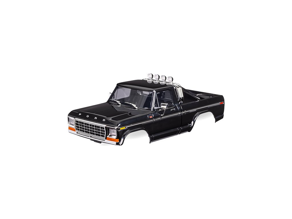 Traxxas karosérie Ford F-150 1979 černá, pro RC model auta TRX-4M s delším rozvorem 162 mm (High Trail). Bez-sponková karoserie v měřítku 1:18 z ABS, kompletní, včetně mřížky chladiče, zrcátek, klik dveří, ochranného rámu, stěračů, bočních lišt a dalších detailů. Vyžaduje přední a zadní nárazník TRA9834.
