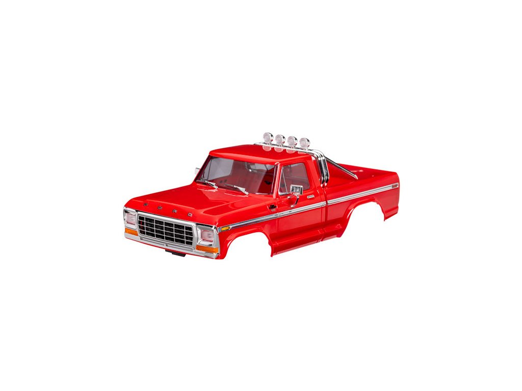 Traxxas karosérie Ford F-150 1979 červená, pro RC model auta TRX-4M s delším rozvorem 162 mm (High Trail). Bez-sponková karoserie v měřítku 1:18 z ABS, kompletní, včetně mřížky chladiče, zrcátek, klik dveří, ochranného rámu, stěračů, bočních lišt a dalších detailů. Vyžaduje přední a zadní nárazník TRA9834.