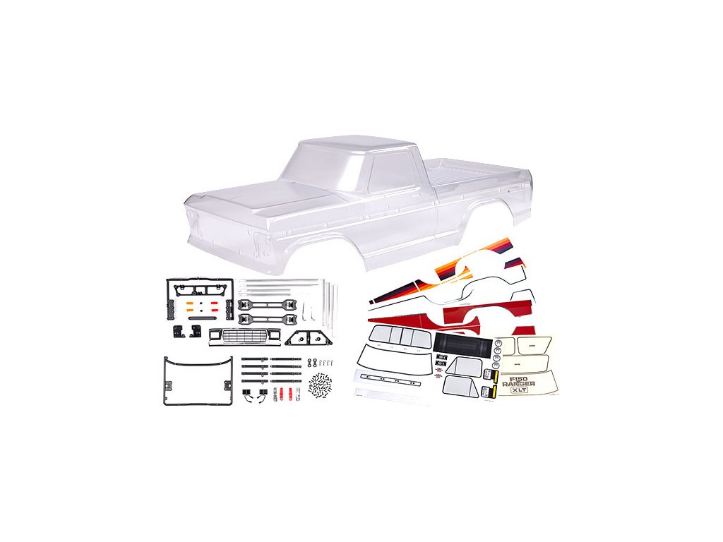 Traxxas karosérie Ford F-150 1979 čirá. Karoserie se dodává vystřižená, vyžaduje barvení a dokončení. Balení obsahuje bezsponkový systém uchycení, lemy blatníků, mřížku chladiče, boční zrcátka, kliky dveří, stěrače, montážní příslušenství, masky oken a polepy.