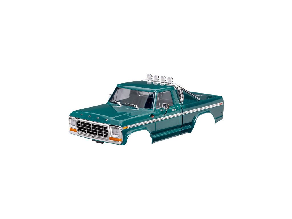 Traxxas karosérie Ford F-150 1979 zelená, pro RC model auta TRX-4M s delším rozvorem 162 mm (High Trail). Bez-sponková karoserie v měřítku 1:18 z ABS, kompletní, včetně mřížky chladiče, zrcátek, klik dveří, ochranného rámu, stěračů, bočních lišt a dalších detailů. Vyžaduje přední a zadní nárazník TRA9834.