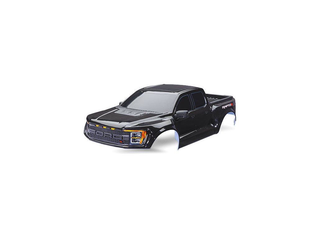 Karosérie Traxxas Ford F-150 Raptor R černá, kompletní. Včetně mřížky chladiče, zadního panelu kufru, bočních zrcátek, masky oken a archu samolepek. Určeno pro montáž na bezsponkový systém uchycení Traxxas - TRA10124 a TRA10125. Není určená na modely Slash.