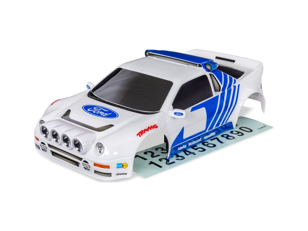 Traxxas karosérie Ford RS200 bílá. Hotová, nabarvená a sestavená karoserie s aplikovanými polepy. Včetně bezsponkového držáku.