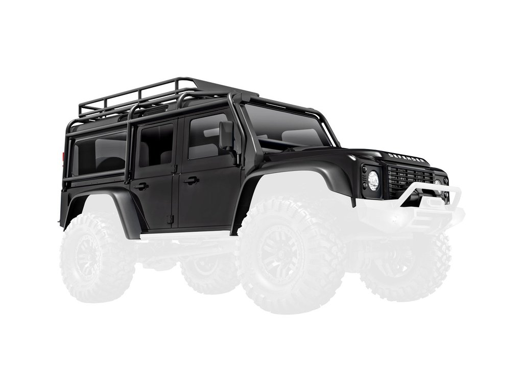 Traxxas karosérie Land Rover Defender černá pro RC model auta TRX-4M. Bez-sponková karoserie v měřítku 1:18 z ABS, kompletní, včetně čirých oken, makety rezervního kola, kanystrů, heveru, lemů blatníků, bočních zrcátek a dalších detailů.