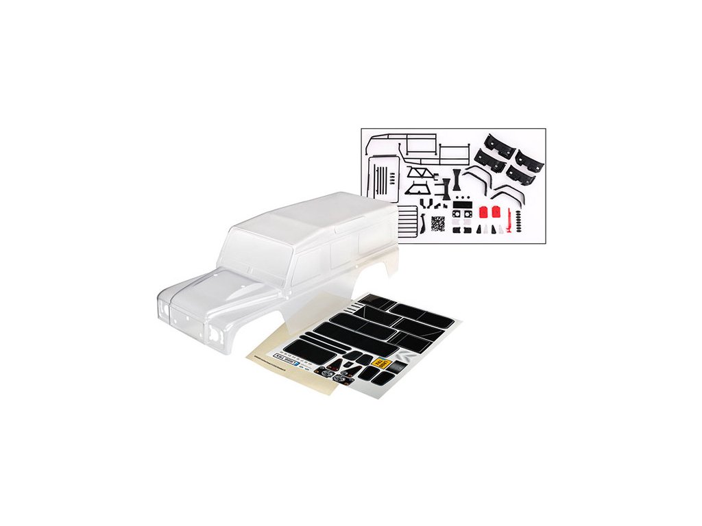 Kompletní čirá karoserie Land Rover Defender, vyžaduje barvení a kompletaci. (Obsahuj mřížku chladiče, boční zrcátka, kliky dveří, stěrače, střešní nosič, náhradní pneu, masky oken a nálepky). Pro rozvor 324mm.