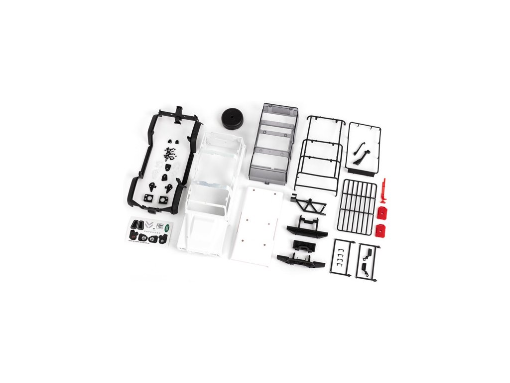 Traxxas karosérie Land Rover Defender nenabarvená bílá, kompletní (nesestavená), pro RC model auta TRX-4M. Bez-sponková karoserie v měřítku 1:18 z ABS, včetně čirých oken, makety rezervního kola, kanystrů, heveru, lemů blatníků, bočních zrcátek a dalších detailů.