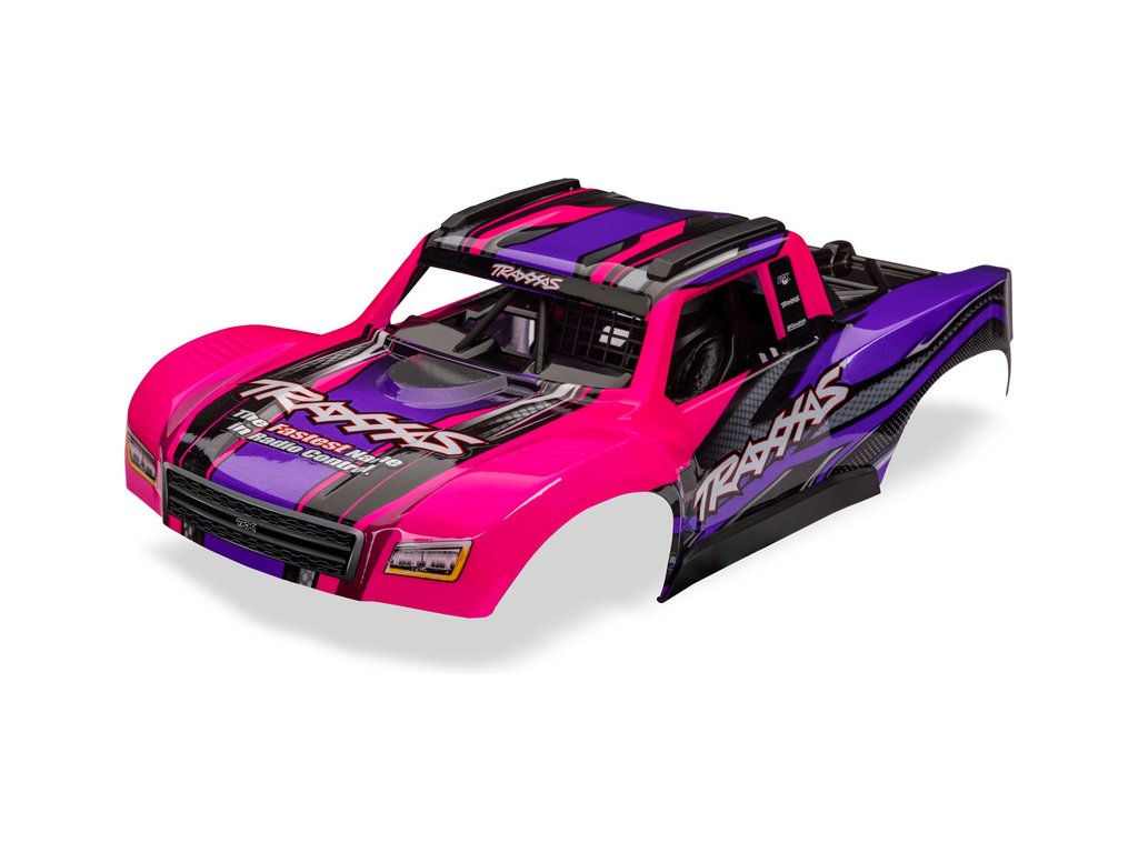 Náhradní díl pro RC model auta 1:12 Traxxas Mini Slash: karosérie Mini Slash růžová. Hotová, nabarvená a sestavená karoserie, včetně instalovaného kokpitu a bezsponkového držáku.