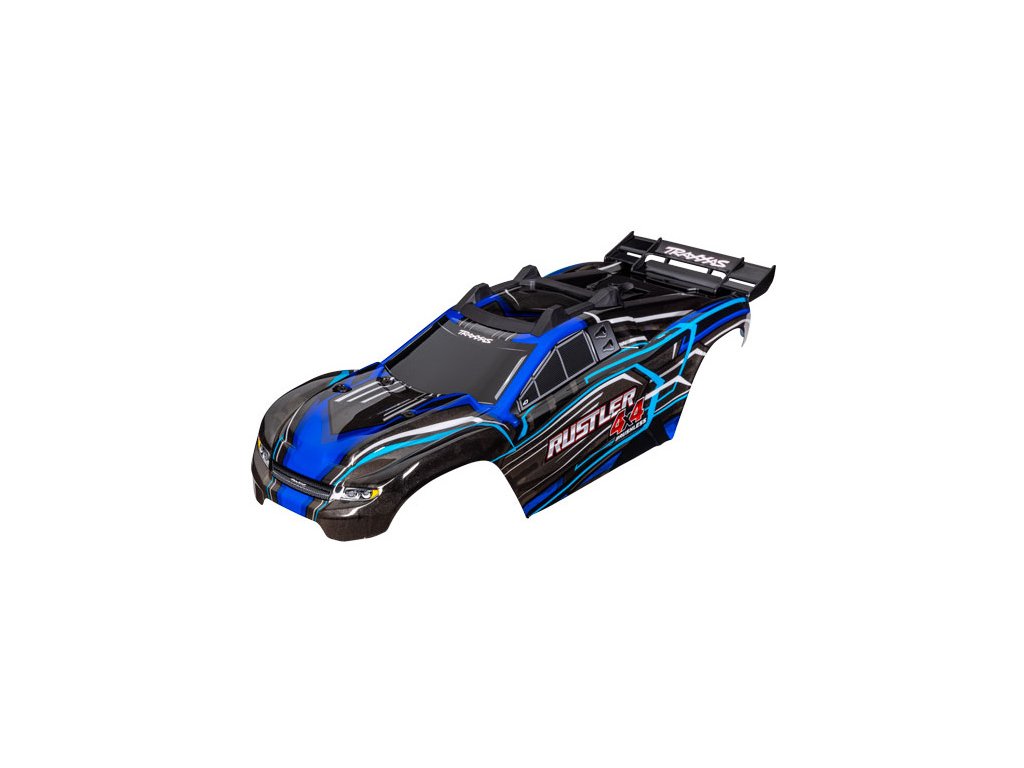 Traxxas karosérie Rustler 4X4 modrá. Nabarvená, sestavená karoserie, včetně bezsponkového držáku pro upevnění a střešního rámu.