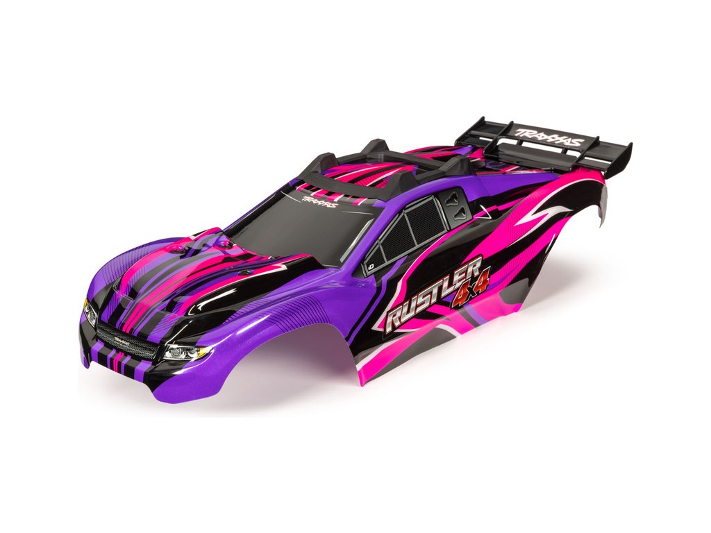Hotová Traxxas karosérie Rustler 4X4 růžovo-fialová, má kompletní a hotové zbarvení s aplikovanými obtisky. Tato odolná polykarbonátová karosérie má nejžhavější originální barevnou kreaci a je připravena k montáži na vaše auto Traxxas Rustler. Není třeba ořezávat karosérii nebo vrtat montážní otvory.