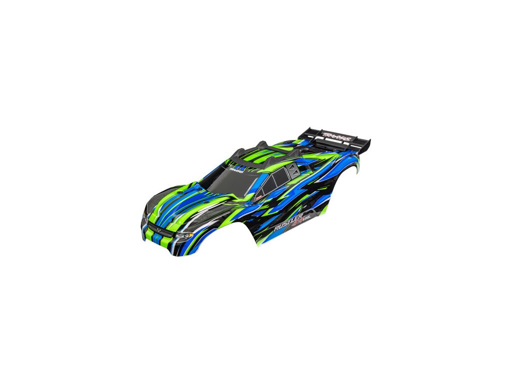Náhradní díl pro RC modely aut Traxxas Rustler 4x4 1:10 VXL: karosérie zelená. Nabarvená, aplikované obtisky, sestavená s předním a zadním držákem nástavby a zadní podpěrou nástavby pro montáž bez klipů. Rozvor 295mm.