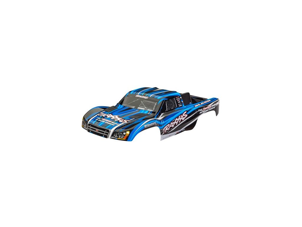 Traxxas karosérie Slash 4X4 modrá (bezsponková). Nabarvená, sestavená karoserie, včetně bezsponkového držáku pro upevnění. Pro starší šasi Slash se sponkovým systémem upínaní karoserie je vyžadován díl #6940 (Slash 2WD), nebo díly #6976 a #10125 (Slash 4x4).