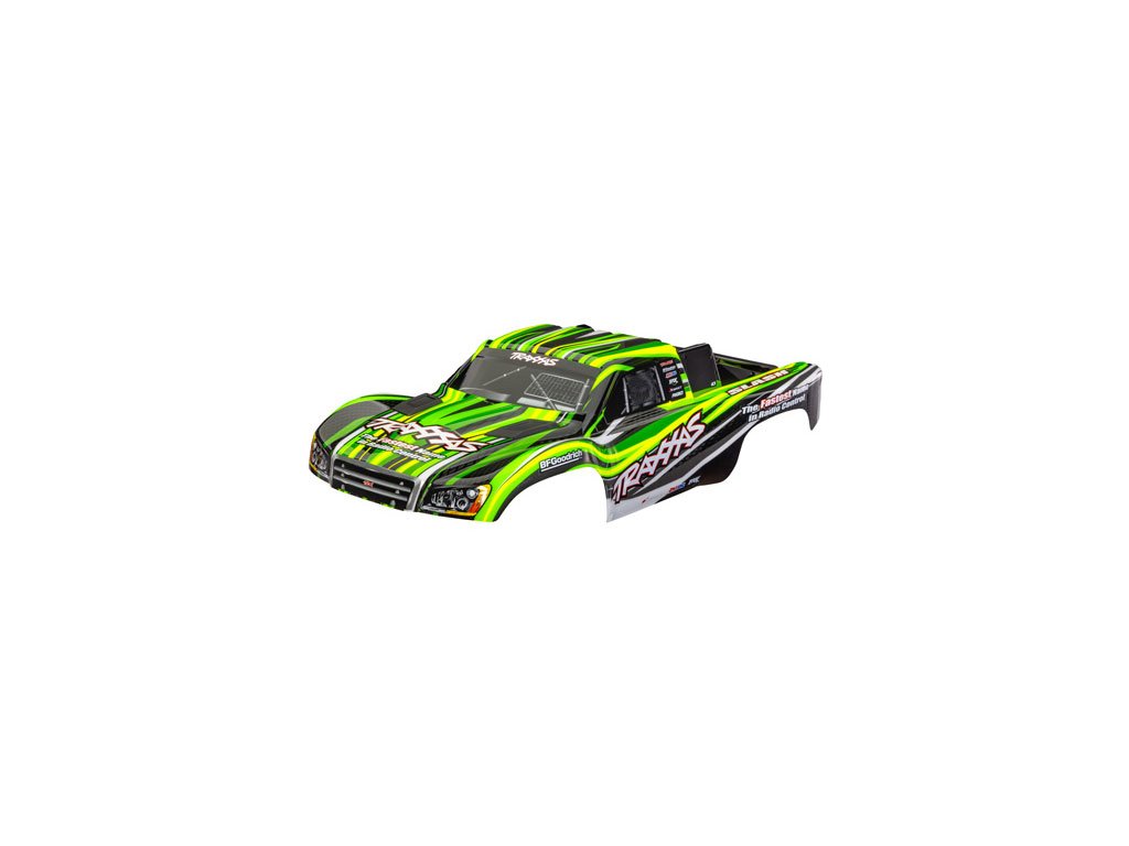 Traxxas karosérie Slash 4X4 zelená (bezsponková) (také vhodná pro Slash VXL a Slash 2WD). Nabarvená, sestavená karoserie, včetně bezsponkového držáku pro upevnění. Pro starší šasi Slash se sponkovým systémem upínaní karoserie je vyžadován díl #6940 (Slash 2WD), nebo díly #6976 a #10125 (Slash 4x4).