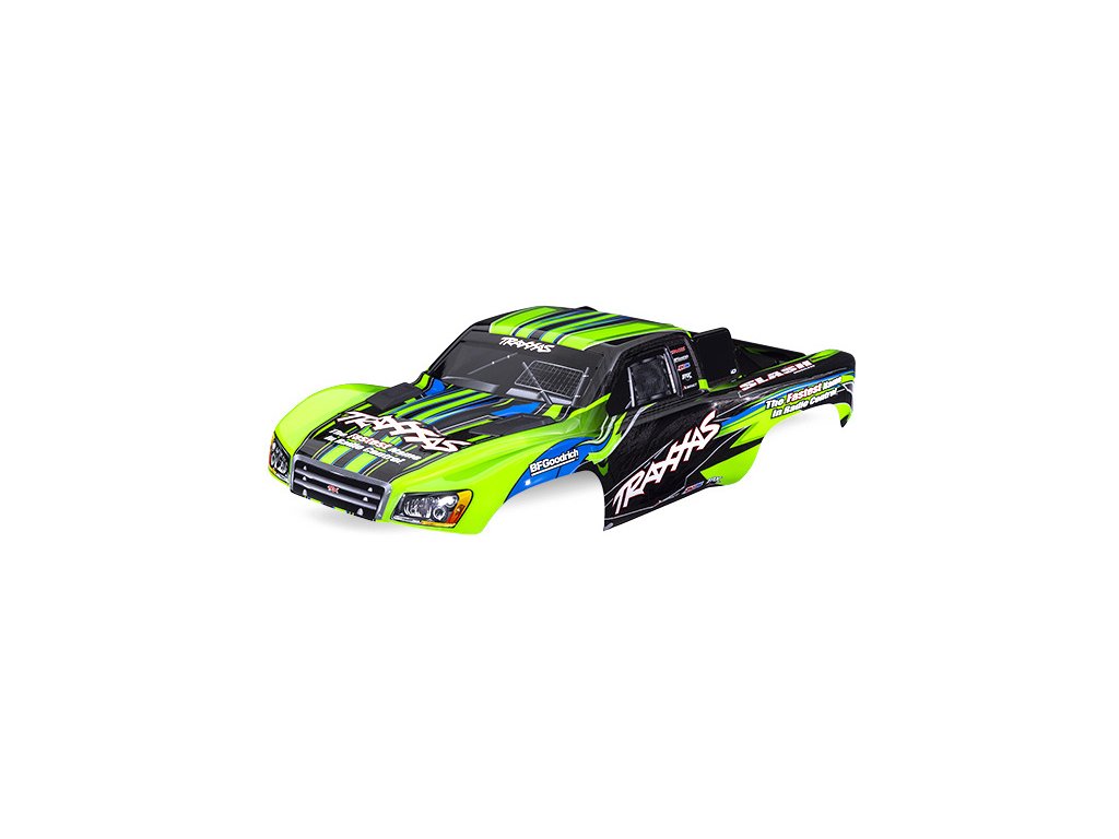 Náhradní díl pro RC modely aut Traxxas Slash 2WD, VXL nebo 4x4: karosérie zelená bezsponková. Hotové zbarvení ProGraphix® s předem aplikovanými obtisky. Smontovaná karosérie s předními a zadními bezsponovými západkami.