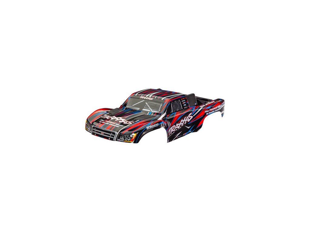 Traxxas karosérie Slash 4X4 červená (bezsponková) (také vhodná pro Slash VXL a Slash 2WD). Nabarvená, sestavená karoserie, včetně bezsponkového držáku pro upevnění. Pro starší šasi Slash se sponkovým systémem upínaní karoserie je vyžadován díl #6940 (Slash 2WD), nebo díly #6976 a #10125 (Slash 4x4).