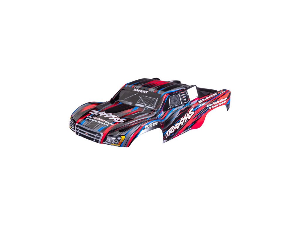 Traxxas karosérie Slash 4X4 červená. Nabarvená, sestavená karoserie, včetně bezsponkového držáku pro upevnění. Pro starší šasi Slash se sponkovým systémem upínaní karoserie je vyžadován díl #6940 (Slash 2WD), nebo díly #6976 a #10125 (Slash 4x4).