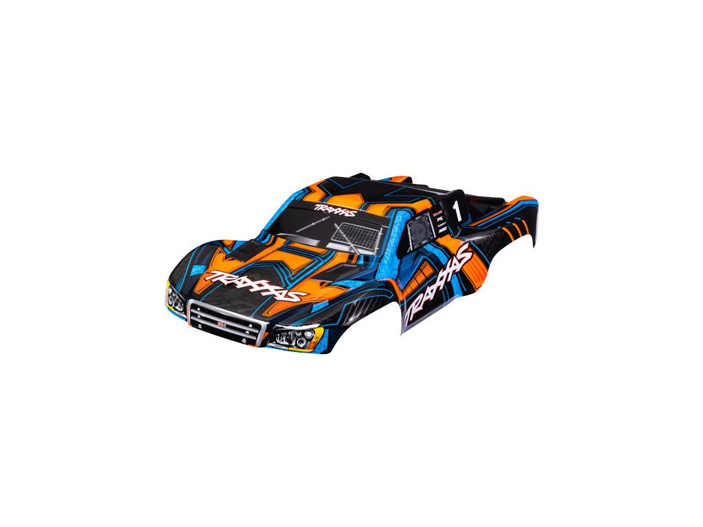 Traxxas karosérie Slash 4X4 oranžovo-modrá (bezsponková). Nabarvená, sestavená karoserie, včetně bezsponkového držáku pro upevnění. Pro starší šasi Slash se sponkovým systémem upínaní karoserie je vyžadován díl #6940 (Slash 2WD), nebo díly #6976 a #10125 (Slash 4x4).