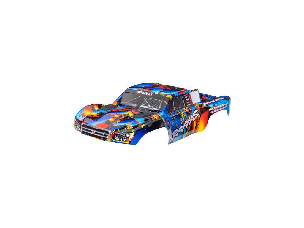 Traxxas karosérie Slash 4X4 Rock n' Roll (bezsponková) (také vhodná pro Slash VXL a Slash 2WD). Nabarvená, sestavená karoserie, včetně bezsponkového držáku pro upevnění. Pro starší šasi Slash se sponkovým systémem upínaní karoserie je vyžadován díl #6940 (Slash 2WD), nebo díly #6976 a #10125 (Slash 4x4).