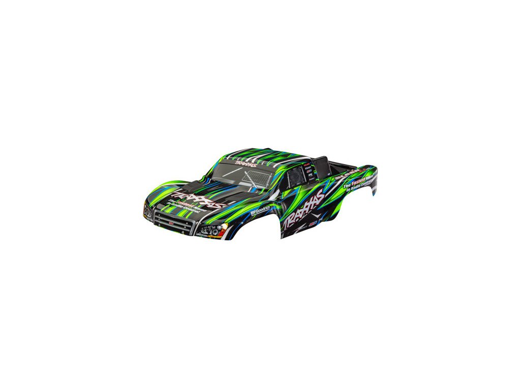 Traxxas karosérie Slash 4X4 zelená (bezsponková) (také vhodná pro Slash VXL a Slash 2WD). Nabarvená, sestavená karoserie, včetně bezsponkového držáku pro upevnění. Pro starší šasi Slash se sponkovým systémem upínaní karoserie je vyžadován díl #6940 (Slash 2WD), nebo díly #6976 a #10125 (Slash 4x4).