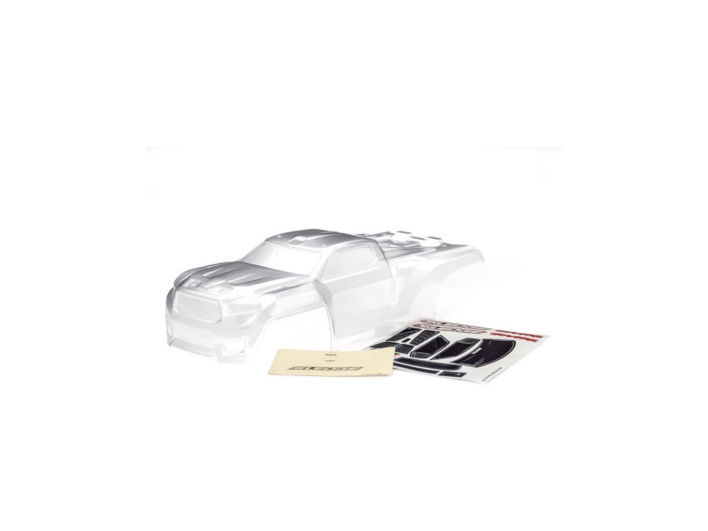 Čirá nenabarvená karosérie pro RC model auta Traxxas Sledge. Součástí balení jsou samolepky a krycí masky pro zakrytí oken.