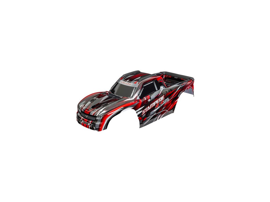 Náhradní díl pro RC modely aut Traxxas Stampede 4x4 1:10 VXL: karosérie červená. Nabarvená, aplikované obtisky, sestavená s předním a zadním držákem nástavby a zadní podpěrou nástavby pro montáž bez klipů. Rozvor 295mm.