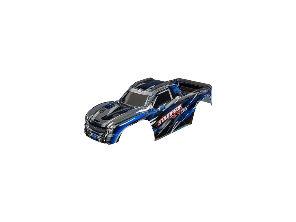 Náhradní díl pro RC modely aut Traxxas Stampede 4x4 1:10 VXL: karosérie modrá. Nabarvená, aplikované obtisky, sestavená s předním a zadním držákem nástavby a zadní podpěrou nástavby pro montáž bez klipů. Rozvor 295mm.