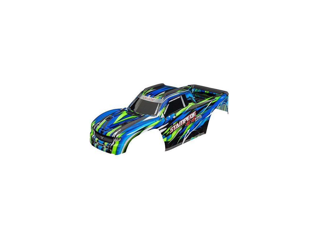 Náhradní díl pro RC modely aut Traxxas Stampede 4x4 1:10 VXL: karosérie zelená. Nabarvená, aplikované obtisky, sestavená s předním a zadním držákem nástavby a zadní podpěrou nástavby pro montáž bez klipů. Rozvor 295mm.