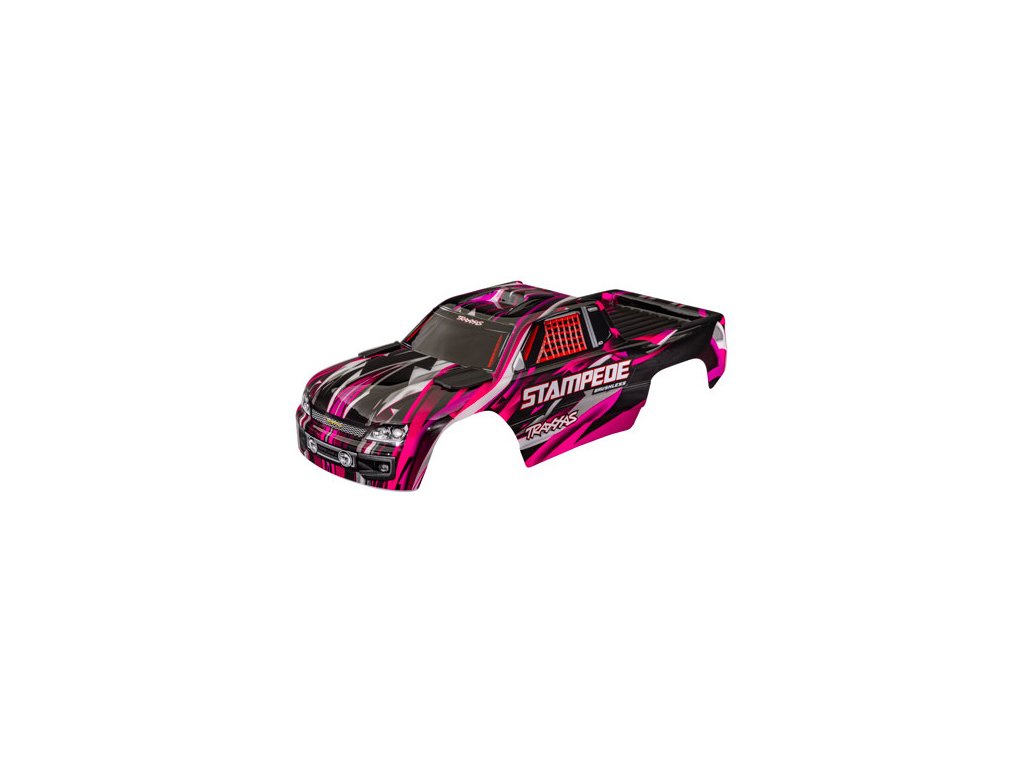 Traxxas karosérie Stampede růžová (bezsponková), hotová nabarvená, aplikované obtisky. Vhodná i pro Stampede VXL. Včetně předního a zadního bezsponkového držáku karoserie.