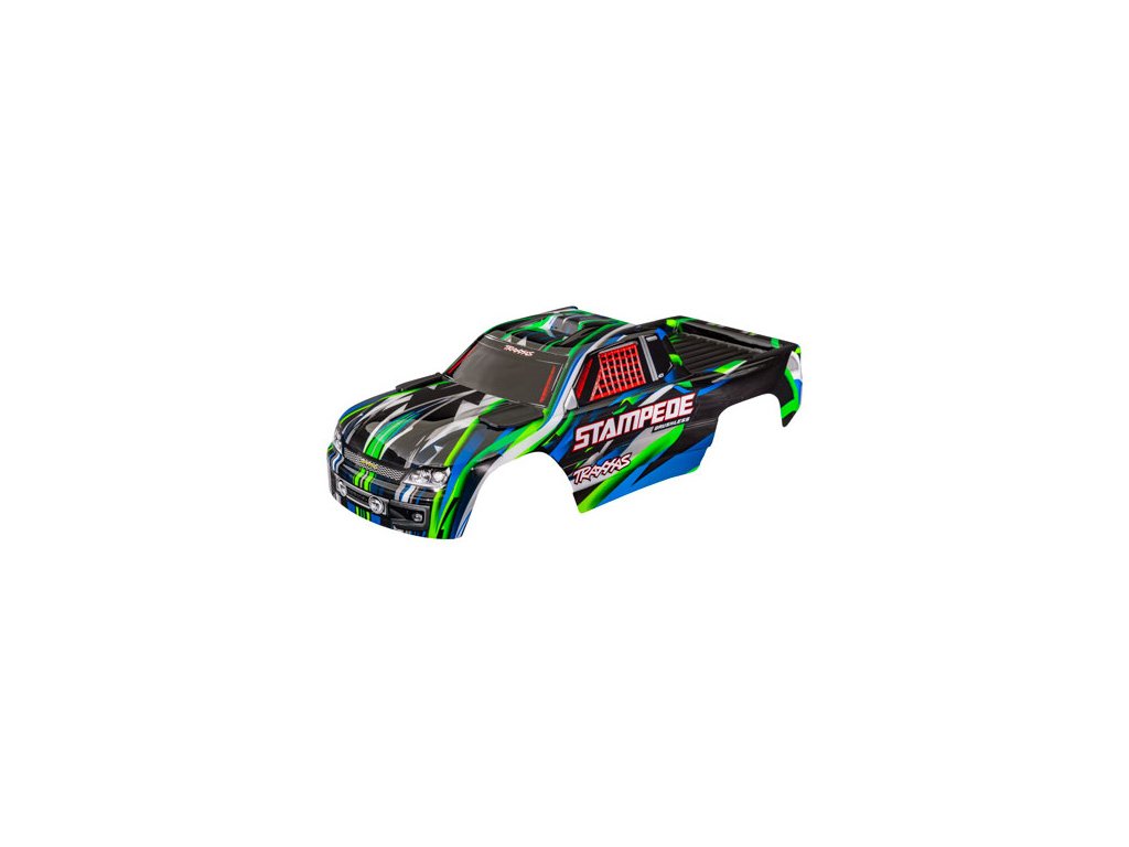 Traxxas karosérie Stampede zelená (bezsponková), hotová nabarvená, aplikované obtisky. Vhodná i pro Stampede VXL. Včetně předního a zadního bezsponkového držáku karoserie.