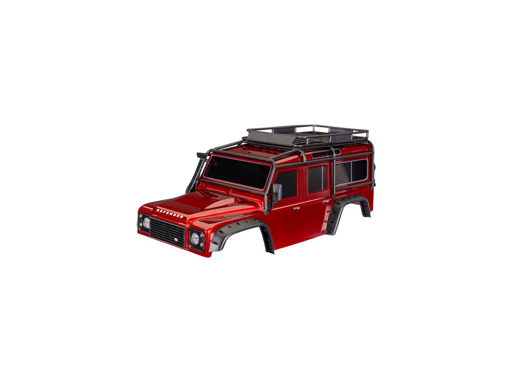 Traxxas karosérie TRX-4 Land Rover Defender červená (bezsponková). Kompletní, nabarvená. Včetně střešního nosiče, maket kanystrů, heveru a rezervního kola. Rozvor 324 mm. Určeno pro montáž na blatníky TRA8080R.