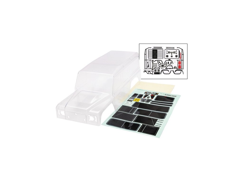 Traxxas karosérie TRX-4 Land Rover Defender čirá (bezsponková). Vyžaduje barvení. Včetně přední masky, zrcátek, klik dveří, střešního nosiče a rezervníko kola. Arch samolepek, maska oken, bezsponkový držák. Kompatibilní s rozvorem 324 mm.