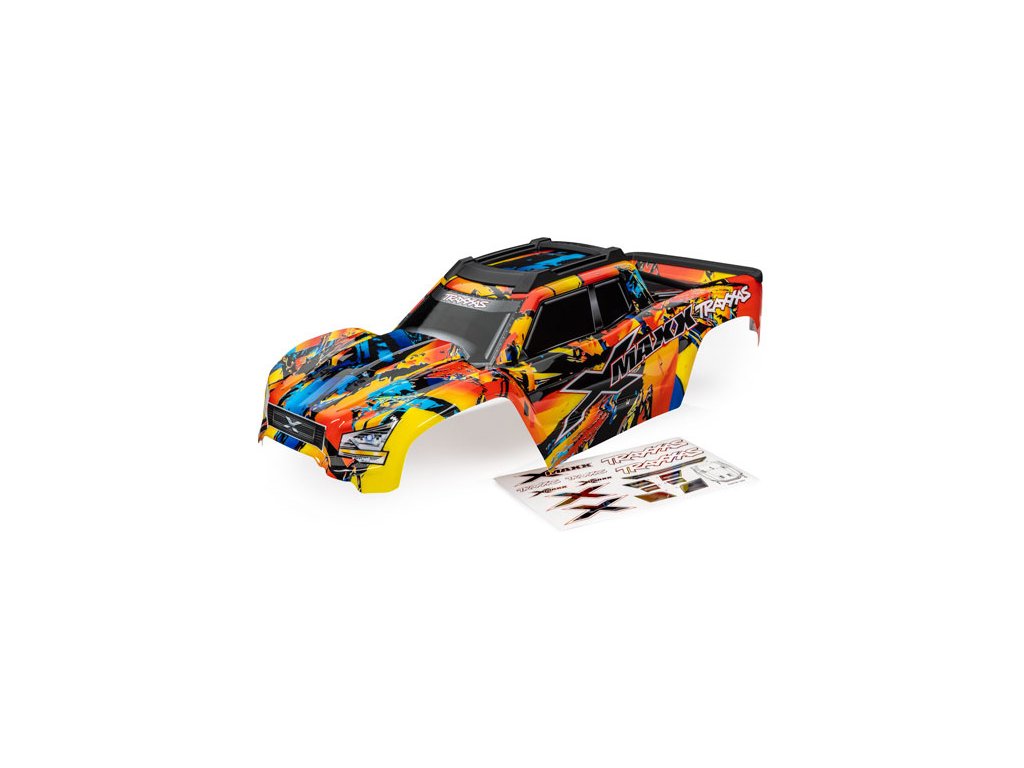 Traxxas karosérie X-Maxx Solar Flare - nabarvená s aplikovanými nálepkami, včetně rámu a ochranných prvků.
