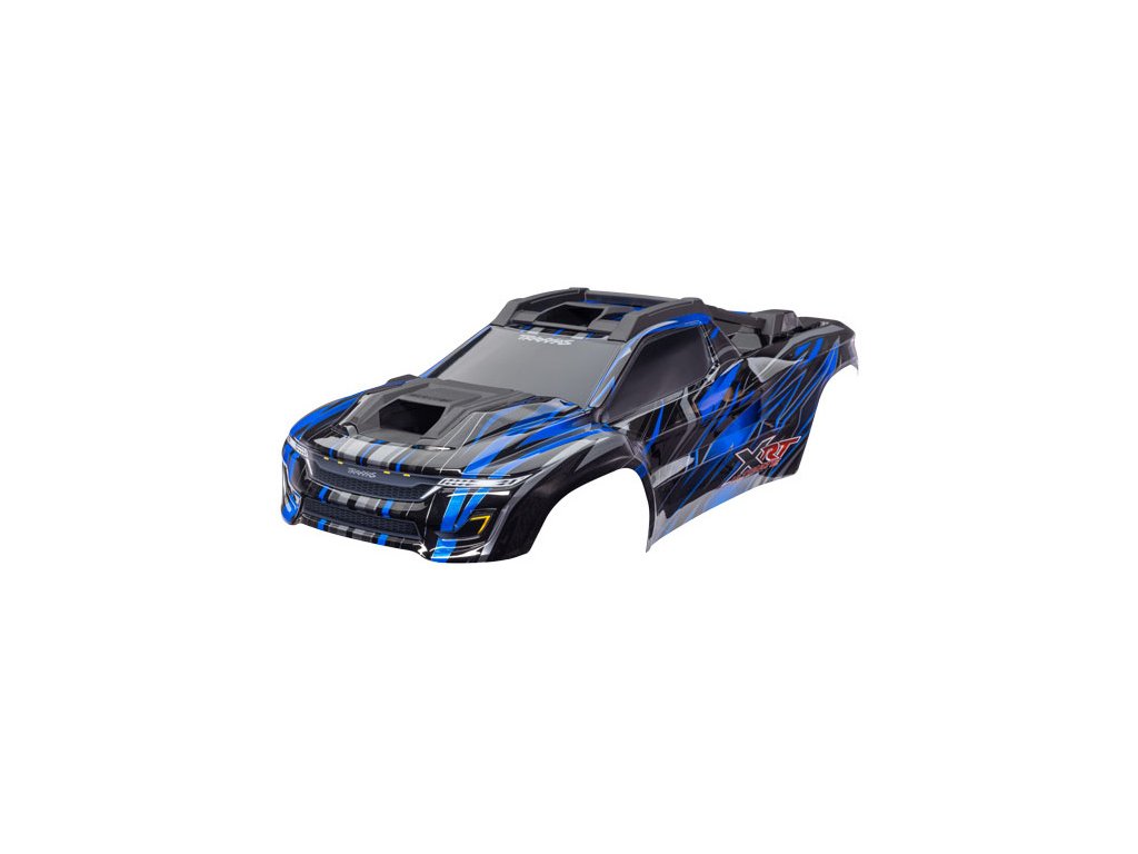 Traxxas karosérie XRT Ultimate modrá, nalakovaná, aplikované obtisky, sestavená s předními a zadními držáky karoserie bezsponkového systému uchycení, ochrannými ližinami střechy a kapoty.