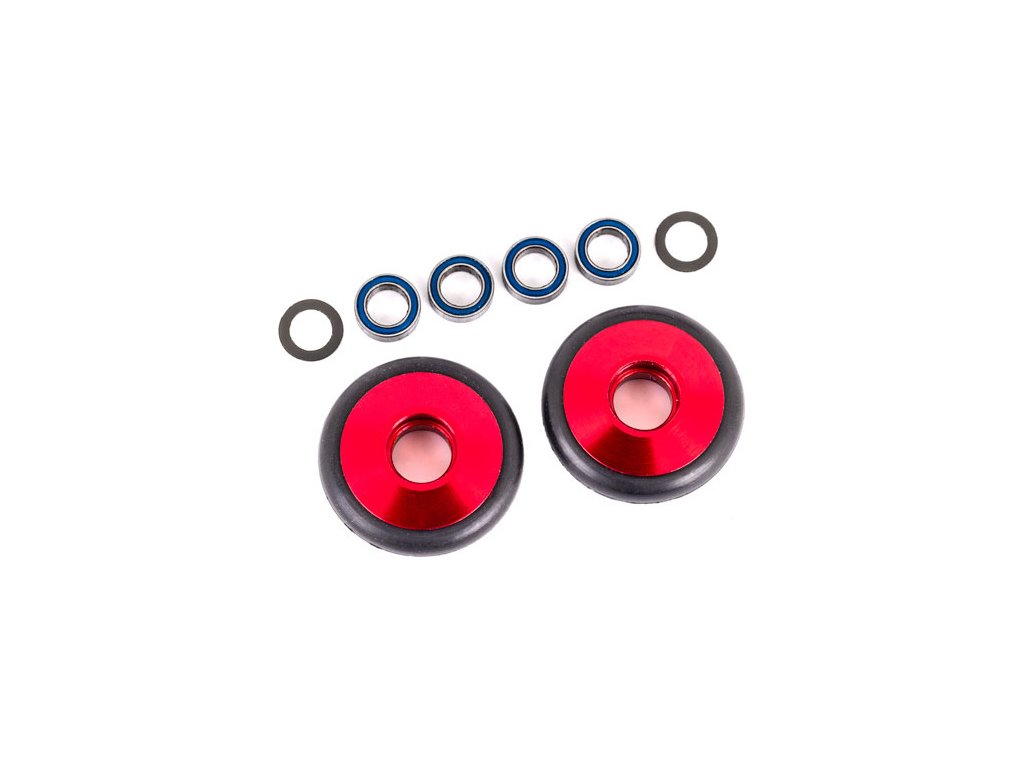 Tuningová kola wheelie z vysoce pevnostního hliníku 6061-T6 s designovým červeným eloxováním a gumovým kroužkem (2 ks), 4x kuličková ložiska 5x8x2.5 mm, 2x podložka 5x8x0.3 mm.