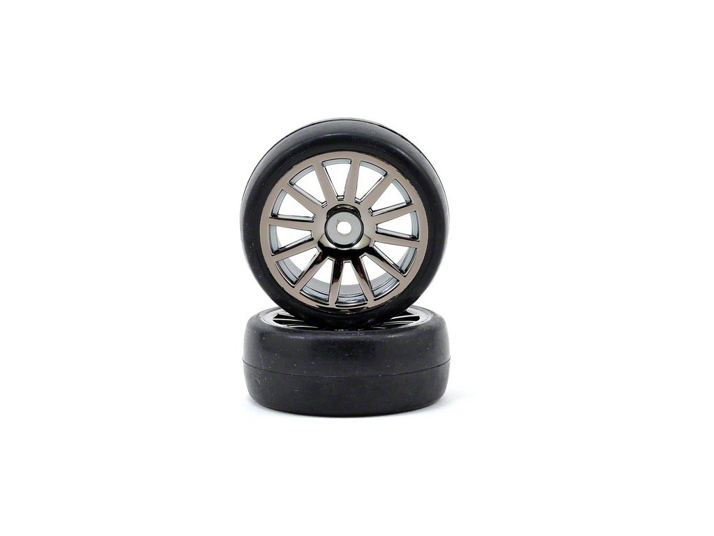 Kompletní univerzální kola pro RC auta LATrax Rally 1:18. Dvanácti-paprskový disk v provedení černý chrom s nalepenými pneumatikami slick.