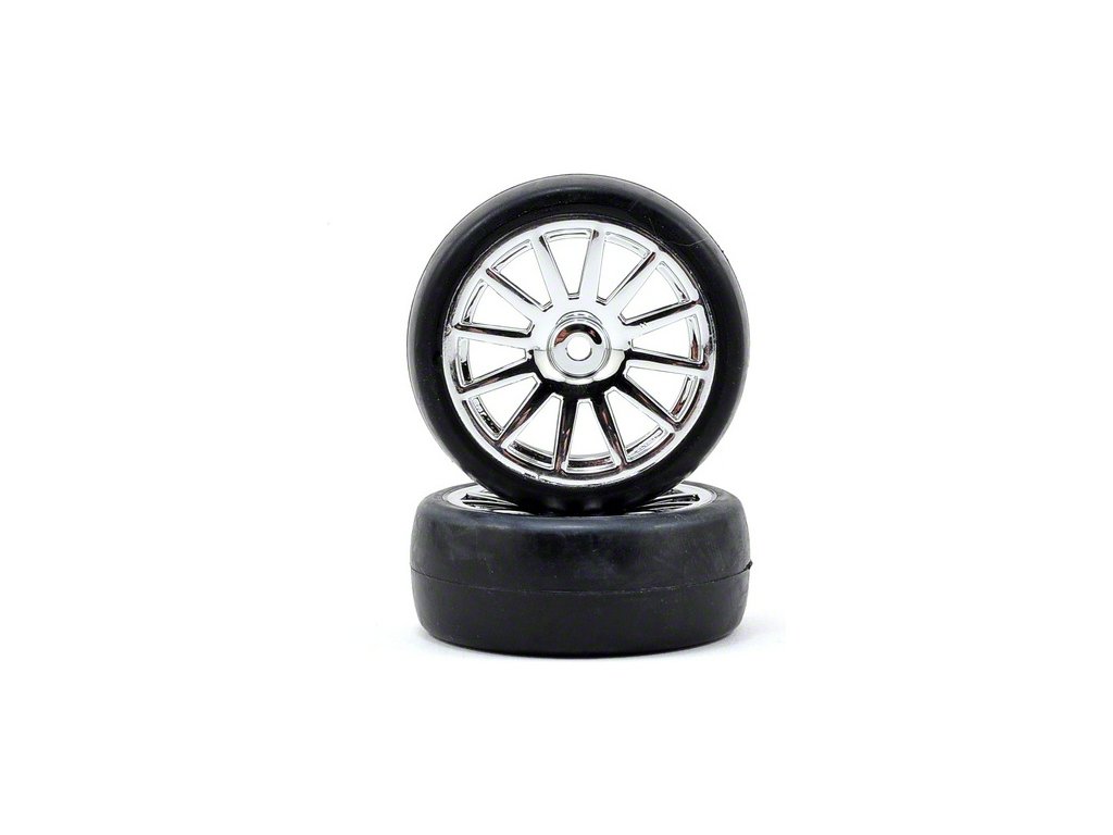 Kompletní univerzální kola pro RC auta LATrax Rally 1:18. Dvanácti-paprskový chromovaný disk s nalepenými pneumatikami slick.