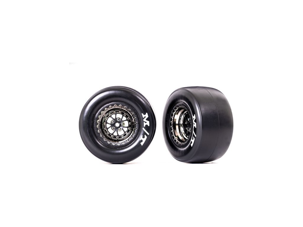 Traxxas kolo, disk Weld černě chromovaný (zadní) (2 ks) s pěnovou vložkou a nalepenými pneumatikami. Zadní dragsterová kola jsou skutečnou replikou. Speciálně vyvinutá směs pneumatik pro maximální přilnavost.