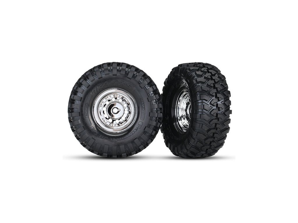 Kompletní univerzální kola. Chromované disky s pneumatikami Canyon Trail pro TRX-4 Ford Bronco (2 ks v balení). Pro použití v jiný modelech TRX-4, je nutné mít na modelu hřídel TRA8255A.